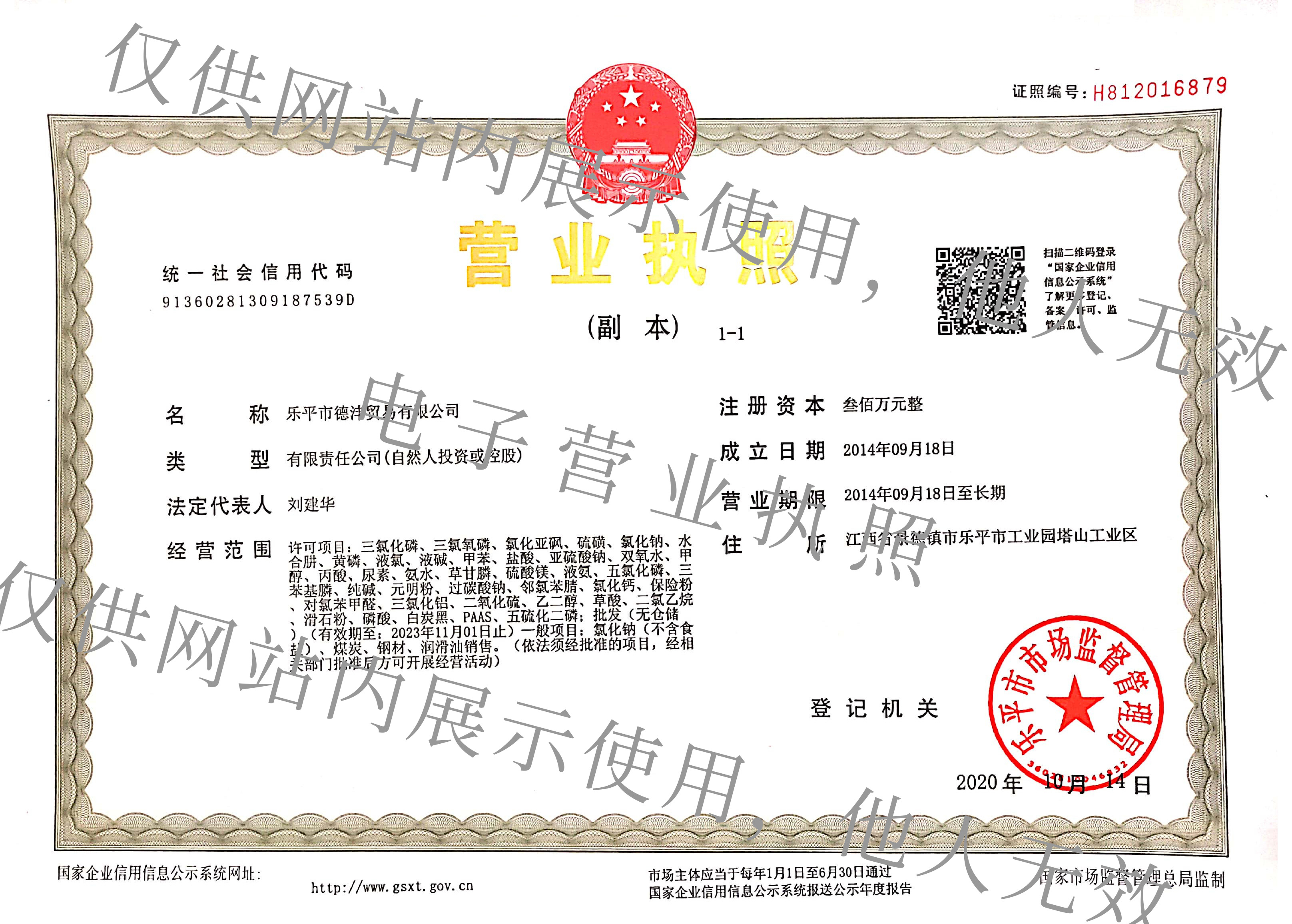 樂(lè)平市德灃貿(mào)易有限公司具有危險(xiǎn)化學(xué)品經(jīng)營(yíng)許可證,主要銷(xiāo)售化工產(chǎn)品。公司目前經(jīng)營(yíng)的化工產(chǎn)品有:工業(yè)鹽、雙氧水、十水、過(guò)碳酸納、液堿、鹽酸、液氯、三氯化磷、三氧氧磷、三氯化鋁、二氯乙烷、氯化亞砜、純堿、硫磺、AC發(fā)泡劑、亞硫酸納、甘氨酸等。&n......
